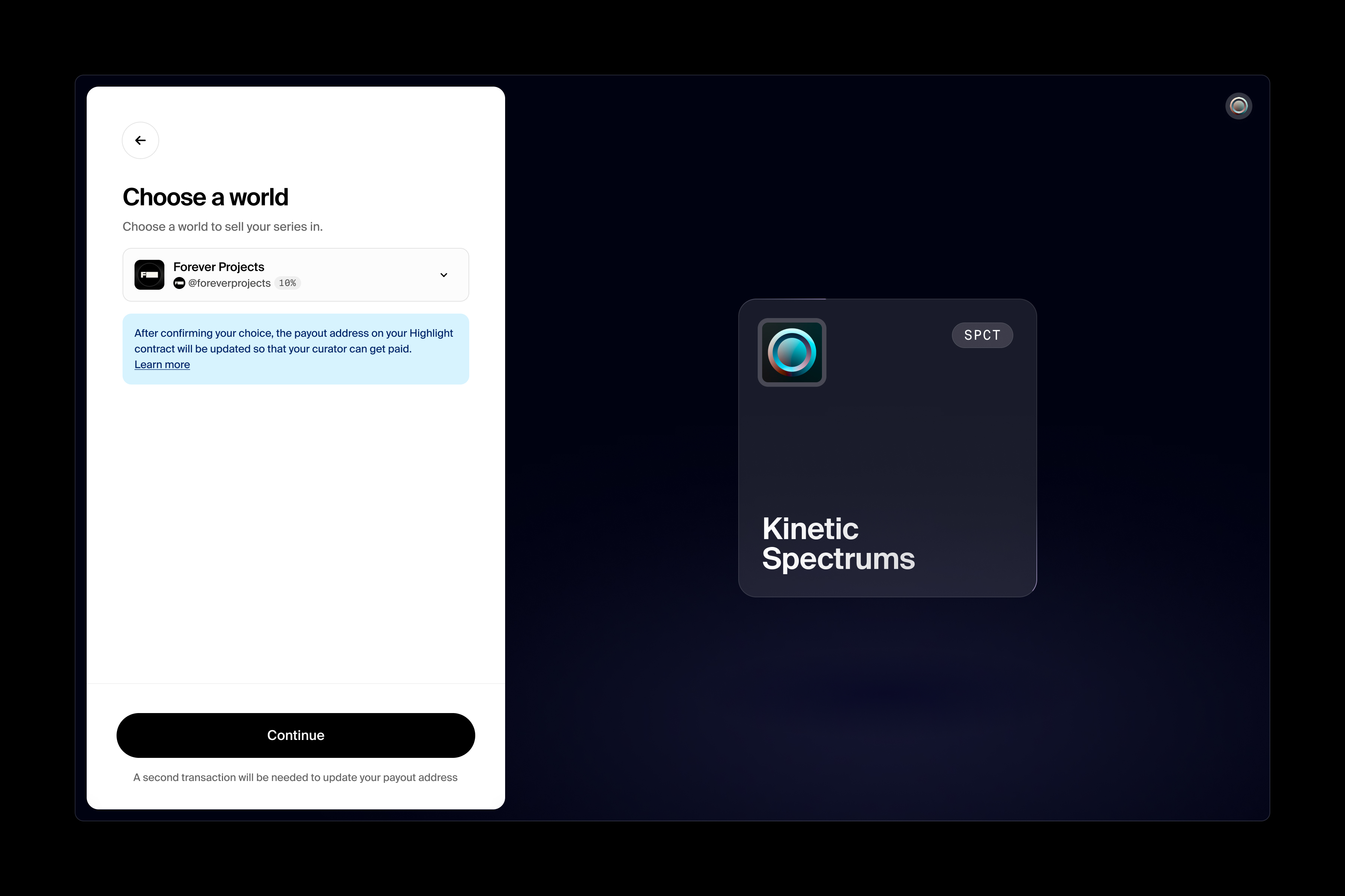 When importing a generative series to a Foundation world, you'll be prompted to update the payout address. This enables commissions to the curator from drop mints. A unique Splits address is used to pay both the artist and curator.