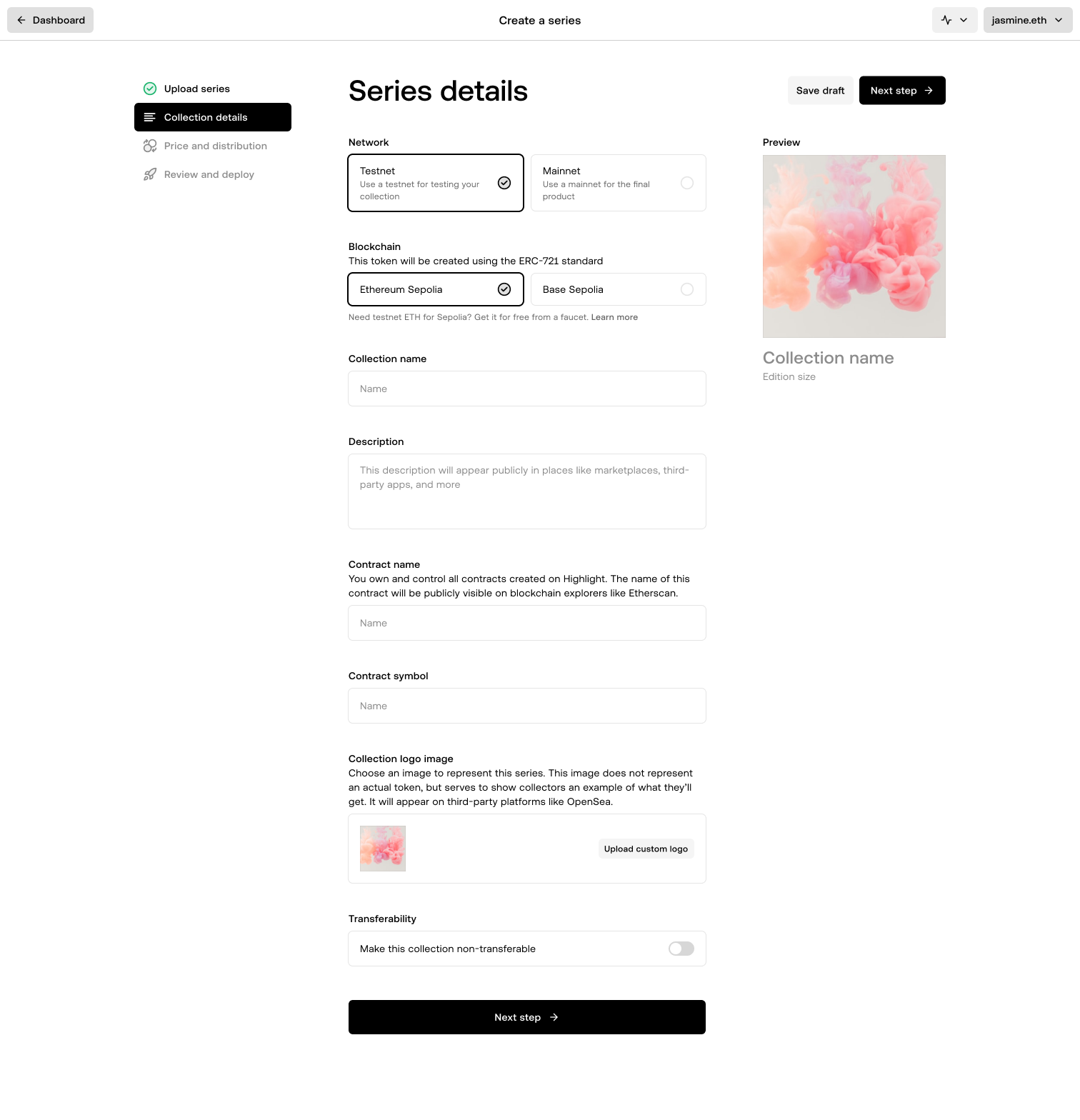 Head over to [Highlight](https://highlight.xyz) and click the "Create" button at the top. Click on "Create a collection" in the top right hand corner and select "Series" from the dropdown.