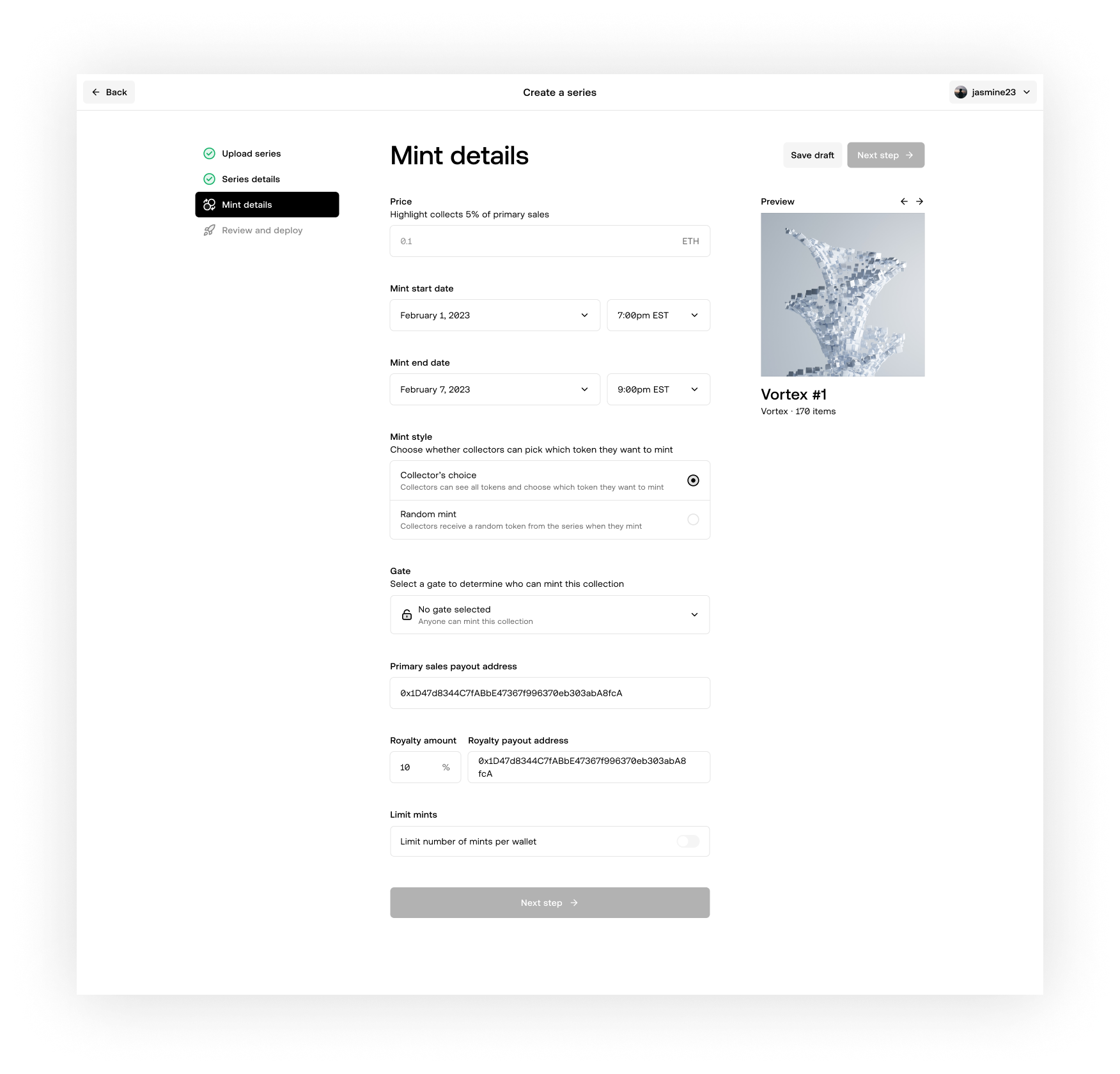 3. Choose your mint style. Collector's choice means the collector can view all the different artwork and pick one to mint. A random mint means that token artwork will be revealed randomly after minting.